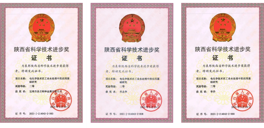陜西省人民政府頒布《關于2021年度陜西省科學技術獎勵的決定》,經省科學技術獎各專業評審組評審、省科學技術獎勵委員會審定和省政府常務會議審議,由西安交通大學牽頭,寶雞市昌立特種金屬有限公司共同完成的《電化學技術在工業水處理中的應用基礎研究》項目被授予“省科學技術進步獎”二等獎。