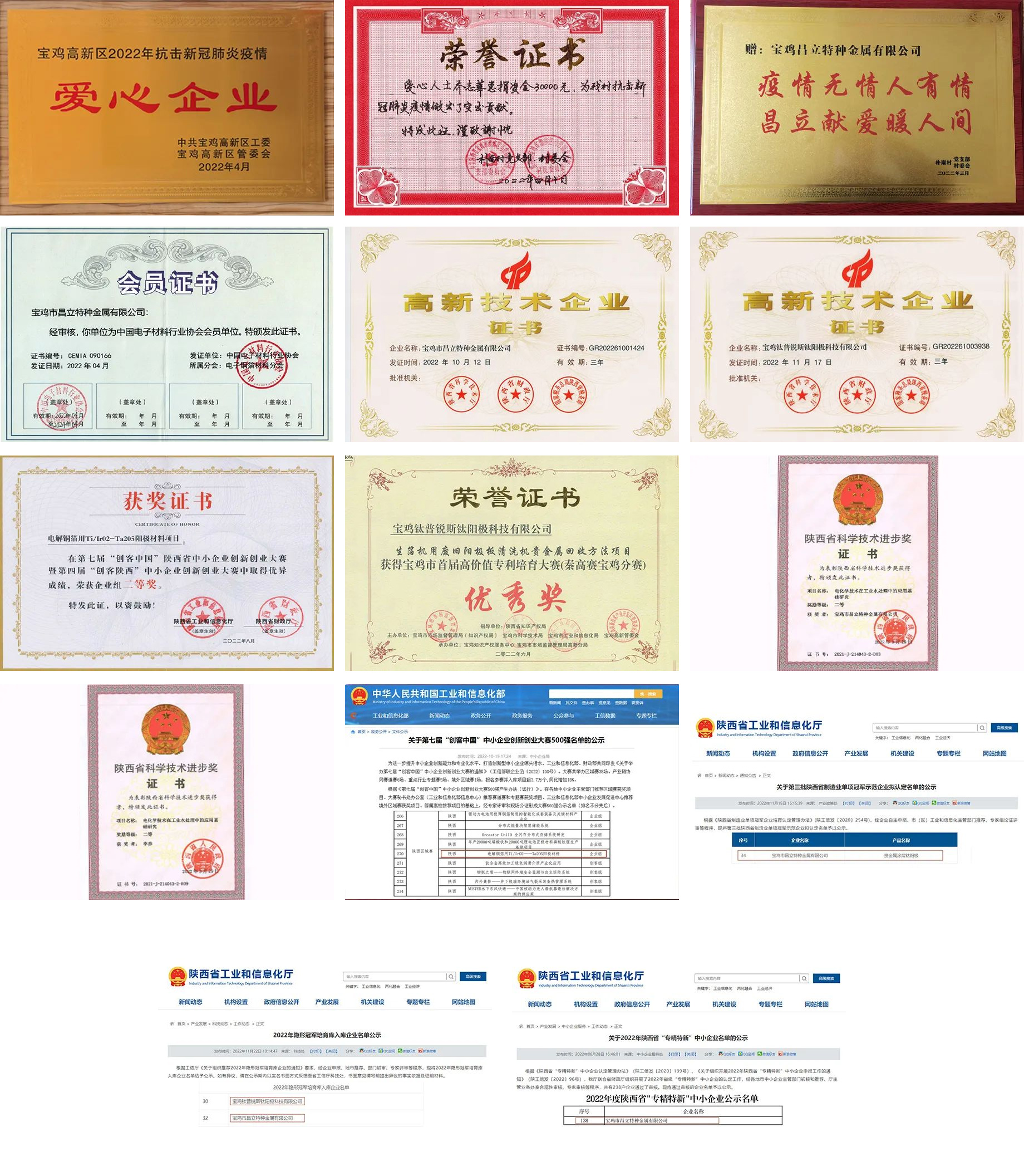 歲月不居,天道酬勤。回顧2022年,公司創(chuàng)造了可喜可賀的成績。在疫情期間承擔(dān)社會責(zé)任,助力一線抗疫。昌立公司被認(rèn)定為陜西省“專精特新”中小企業(yè);《電化學(xué)技術(shù)在工業(yè)水處理中的應(yīng)用基礎(chǔ)研究》項目獲“省科學(xué)技術(shù)進(jìn)步獎”二等獎;入選第三批陜西省制造業(yè)單項冠軍示范企業(yè);入選2022年陜西隱形冠軍培育庫。鈦普銳斯被認(rèn)定為“國家高新技術(shù)企業(yè)”;2022年陜西省秦創(chuàng)原高價值專利大賽分賽區(qū)-“寶雞高價值專利培育大賽優(yōu)秀獎”;第四屆“創(chuàng)客陜西”中小企業(yè)創(chuàng)新創(chuàng)業(yè)大賽省級決賽獲大賽企業(yè)組二等獎;入圍第七屆“創(chuàng)客中國”中小企業(yè)創(chuàng)新創(chuàng)業(yè)大賽500強(qiáng);入選2022年陜西隱形冠軍培育庫。