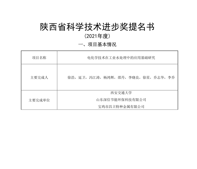 根據陜西省科技獎勵有關要求,現將我司2020年度陜西省科技獎合作申報項目 “電化學技術在工業水處理中的應用基礎研究”信息在公司主頁(http://m.liangtaoshipin.cn/)上公布,向全校征詢異議。